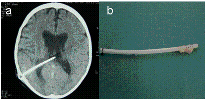 Resim 6: (a) BT’de şantın beyin karıncıkları içindeki kateterin tıkanması sonucu yan karıncıkların genişlemesi görülmektedir, (b) yan karıncıktaki kateterin deliklerinin beyin dokusu tarafından tıkandığı görülmektedir.