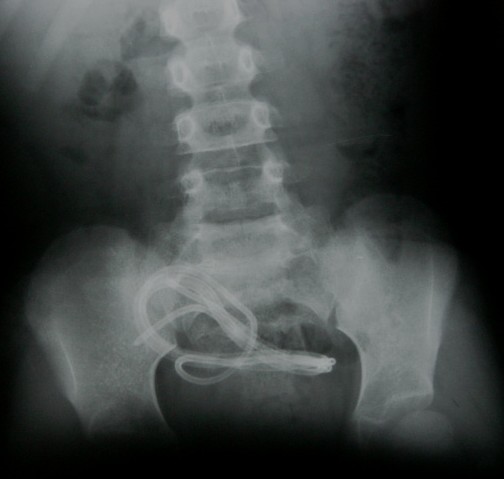 Resim 7: Karın röntgen filminde peritoneal kateterin karın boşluğuna göç etmesi (migrasyon) görülmekte.