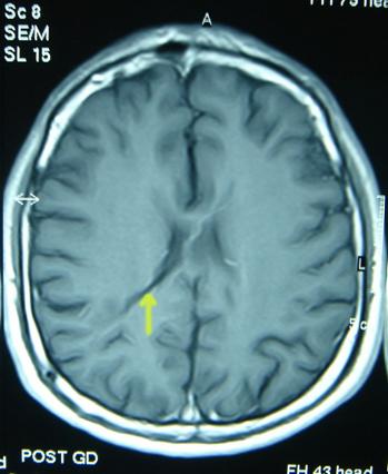 Resim 9: Şant sonrası beyin karıncıklarının ani küçülmesi sonucunda beyin zarı ile beyin dokusu arasında kanama oluştuğunu gösteren BT.