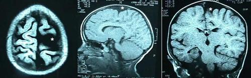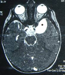 Resim 1: MRG’de şakak bölgesinde Tip I araknoid kist (*).