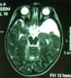 Resim 2: MRG’de beynin şakak bölgesinde beyin şakak bölümünü geriye doğru iten Tip II araknoid kist görülmektedir.
