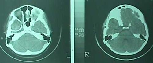 Resim 3: BT de Tip III temporal araknoid kist ve beynin orta hattaki yapılarında karşı tarafa itilme izlenmektedir.