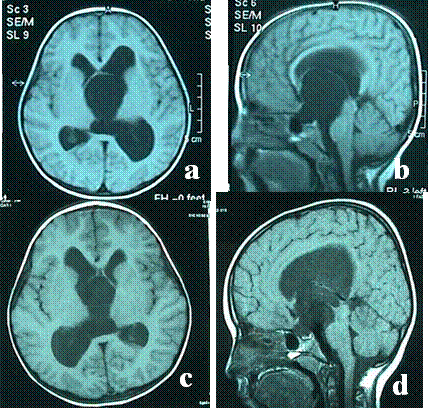 (d) endoskopik ameliyat sonrası kistin küçüldüğü ve yan karıncıklardaki genişlemenin azaldığı izlenmektedir.