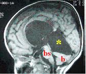(b) dikey MRG kesitlerinde beyincik arkasında yerleşim gösteren araknoid kist.