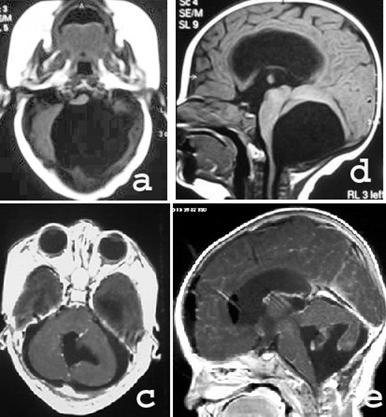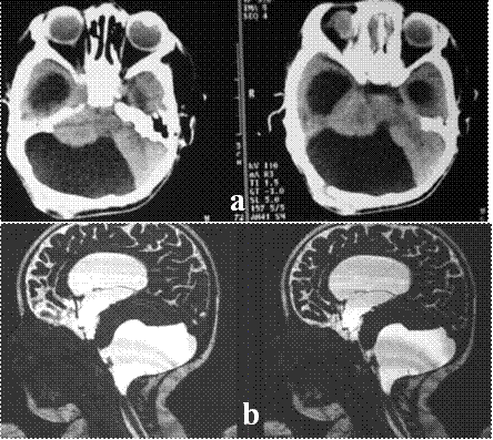 b) yatay ve dikey MRG kesitlerinde dördüncü karıncığı dolduran araknoid kistin ameliyat öncesi görüntüleri.