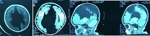 Resim 13: BT ve MRG kesitlerinde İki yarı-beyin küresi arasındaki (interhemisferik) araknoid kist izlenmektedir.