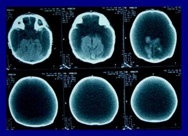 Resim 1: Bilgisayarlı beyin tomografisinde sadece beyin sapı ve beyincik izlenmekte, beyin yarı-kürelerinin kaybolduğu ve yerini BOS’un doldurduğu görülmektedir. Bu görüntü hidranensefali için tipiktir.