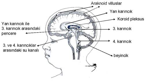 İki tarafta da bulunan yan karıncıklardaki BOSküçük birer pencere ile (foramen Monro)beynin ortasında bulunan üçüncü karıncığa akar ve daha sonra ince ve 1 cm uzunluğundaki bir kanal ile dördüncü karıncık denen diğer bir boşluğa doğru devam eder. Bu akış omurilik merkezine kadar devamlılık sağlar. Dördüncü karıncıktaki deliklerden çıkan BOS omurilik çevresinde ve beyin çevresinde dolaşarak beyin yüzeyindeki büyük toplardamarlara özel dokular (araknoid villus) sayesinde emilerek geri döner (Resim 1). Şimdi hidrosefaliyi tanımak çok daha kolay olacaktır. Hidrosefalinin bilimsel tanımı: beyin boşluklarının (karıncıklarının) genişlemesiyle birlikte beyin-omurilik sıvısının basınç ve miktarında artmadır.